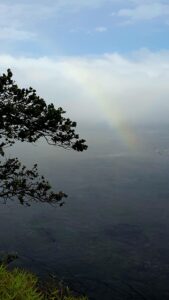 Entre deux épisodes nuages/bourrasques, depuis le belvédère, on arrive quand même à contempler la caldeira dans la trouée d’une éclaircie. Et soleil + pluie… ouiii ! On a même droit à un magnifique arc-en-ciel !