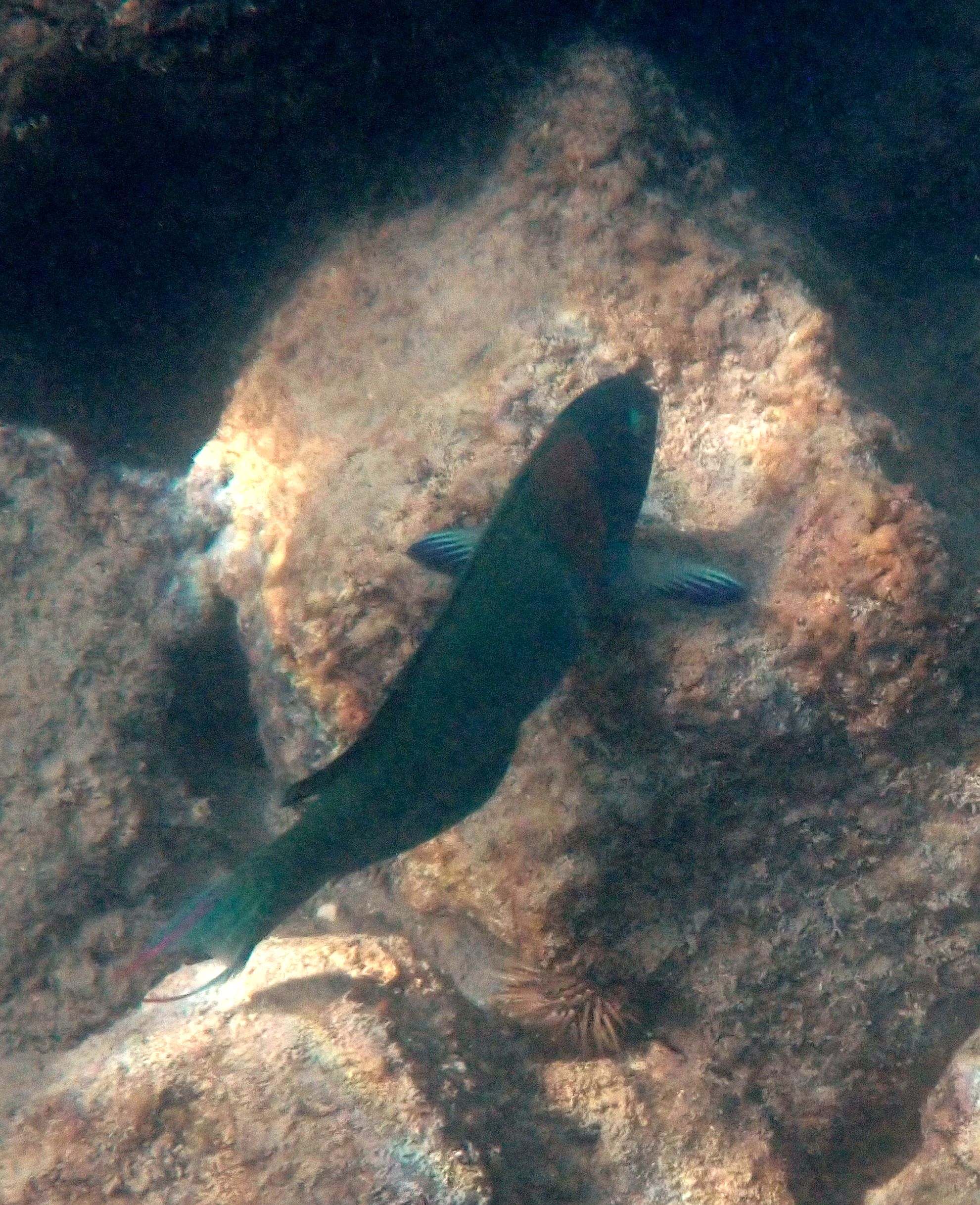 Et toute la faune de poissons de récif traditionnelle, malgré l’absence de barrière de corail sur ces fonds sableux parsemés de blocs de lave.